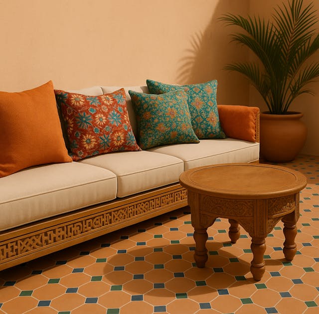 Le salon marocain, chaleureux et enveloppant, incarne l’art de recevoir à la marocaine : canapés bas, étoffes naturelles, lumière tamisée.