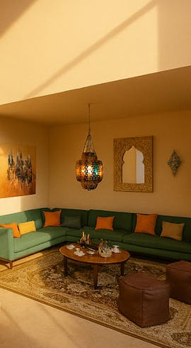 The Moroccan lounge, warm and enveloping, embodies Moroccan hospitality: low sofas, natural fabrics, soft lighting.